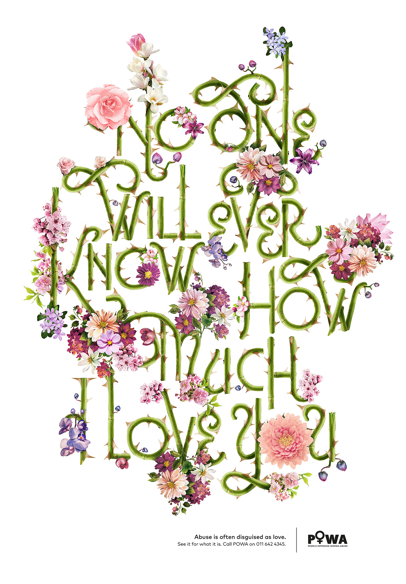This poster is focused on women abused by their husbands or intimate partners and features a ‘loving’ phrase disguised as a ‘loving’ gift of flowers. Upon closer inspection, the chilling reality of the abusive motive behind the words becomes clear. “No one will ever know how much I love you” becomes a veiled threat that keeps years of abuse hidden behind closed doors.
