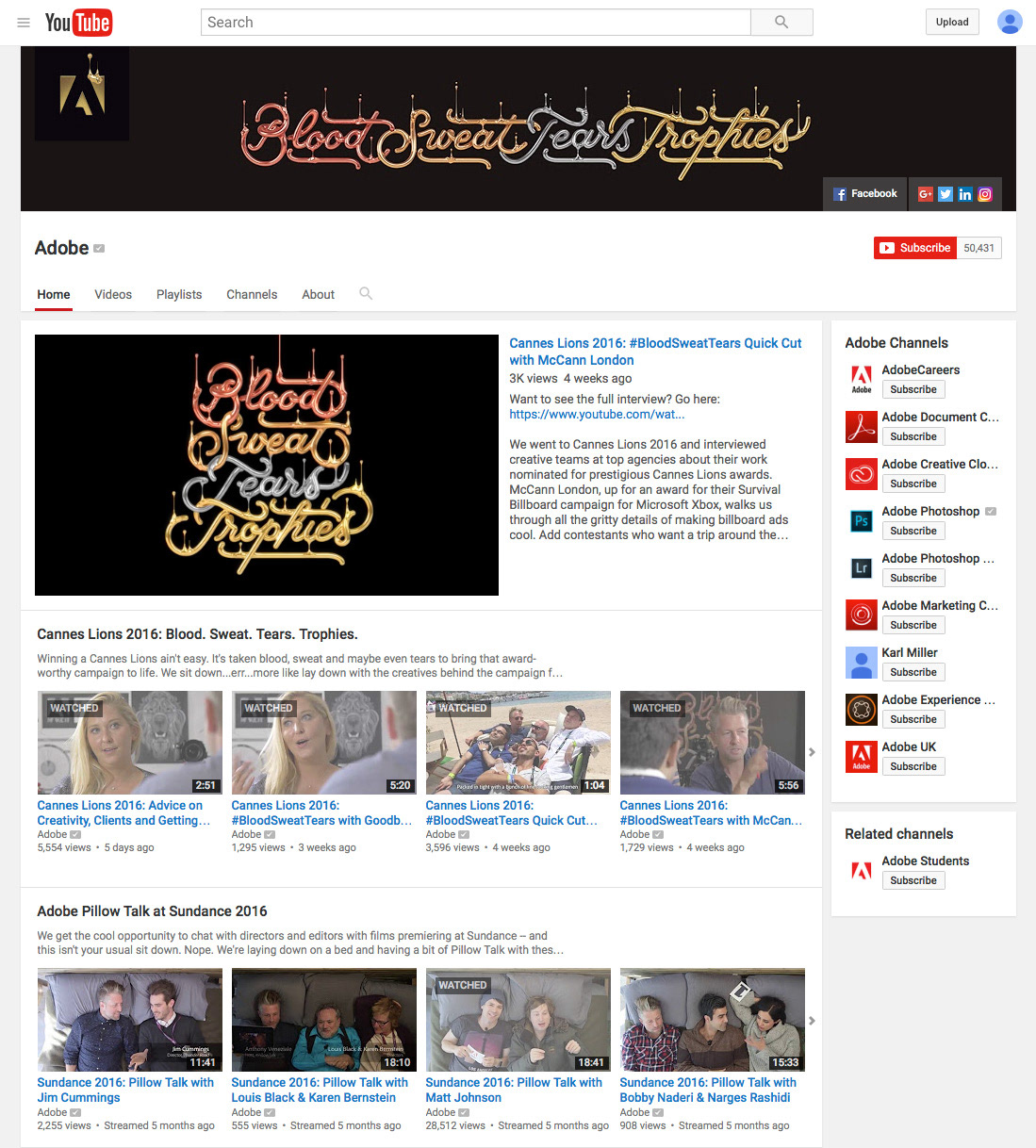 This ad campaign supported Adobe’s presence at the 2016 Cannes Lions International Festival of Creativity. It celebrates festival participants by recognizing how hard they work to get to Cannes – the awards show where they receive the ultimate recognition by their peers. The sentiment “Blood. Sweat. Tears. Trophies.” says Adobe gets it. And the type design celebrates creatives in a very Adobe way: We commissioned various artists to create each of these stunning typographic treatments.