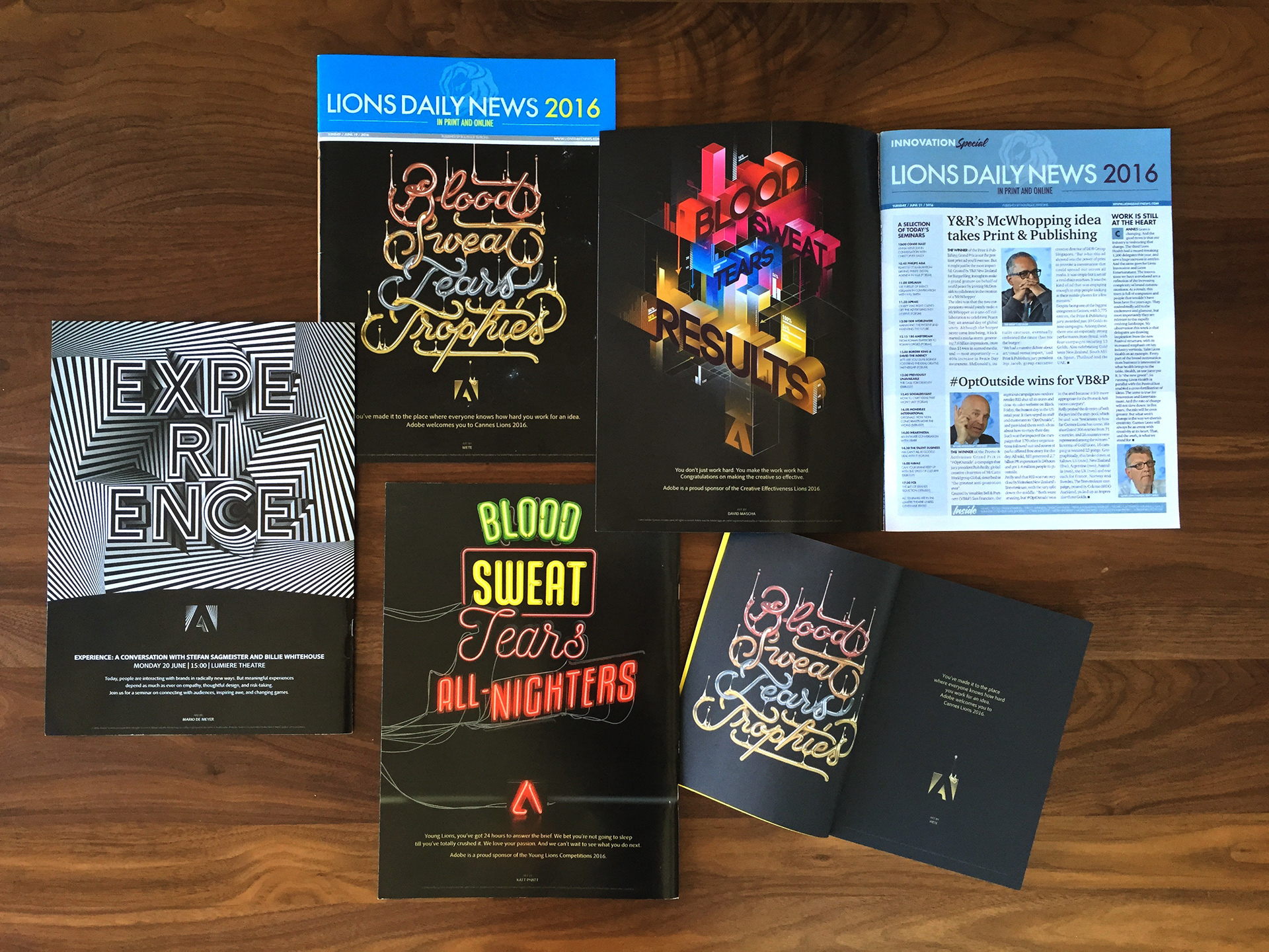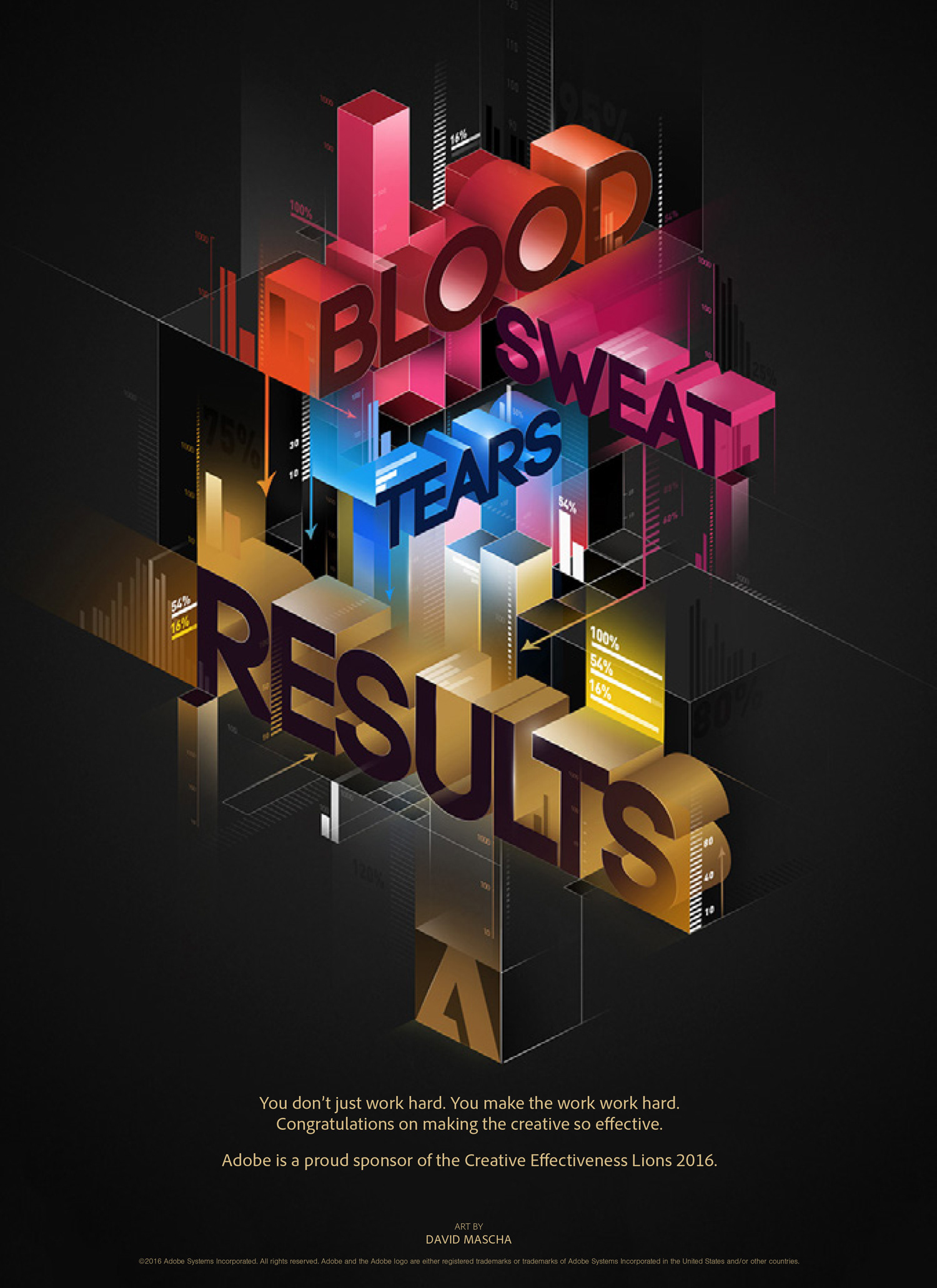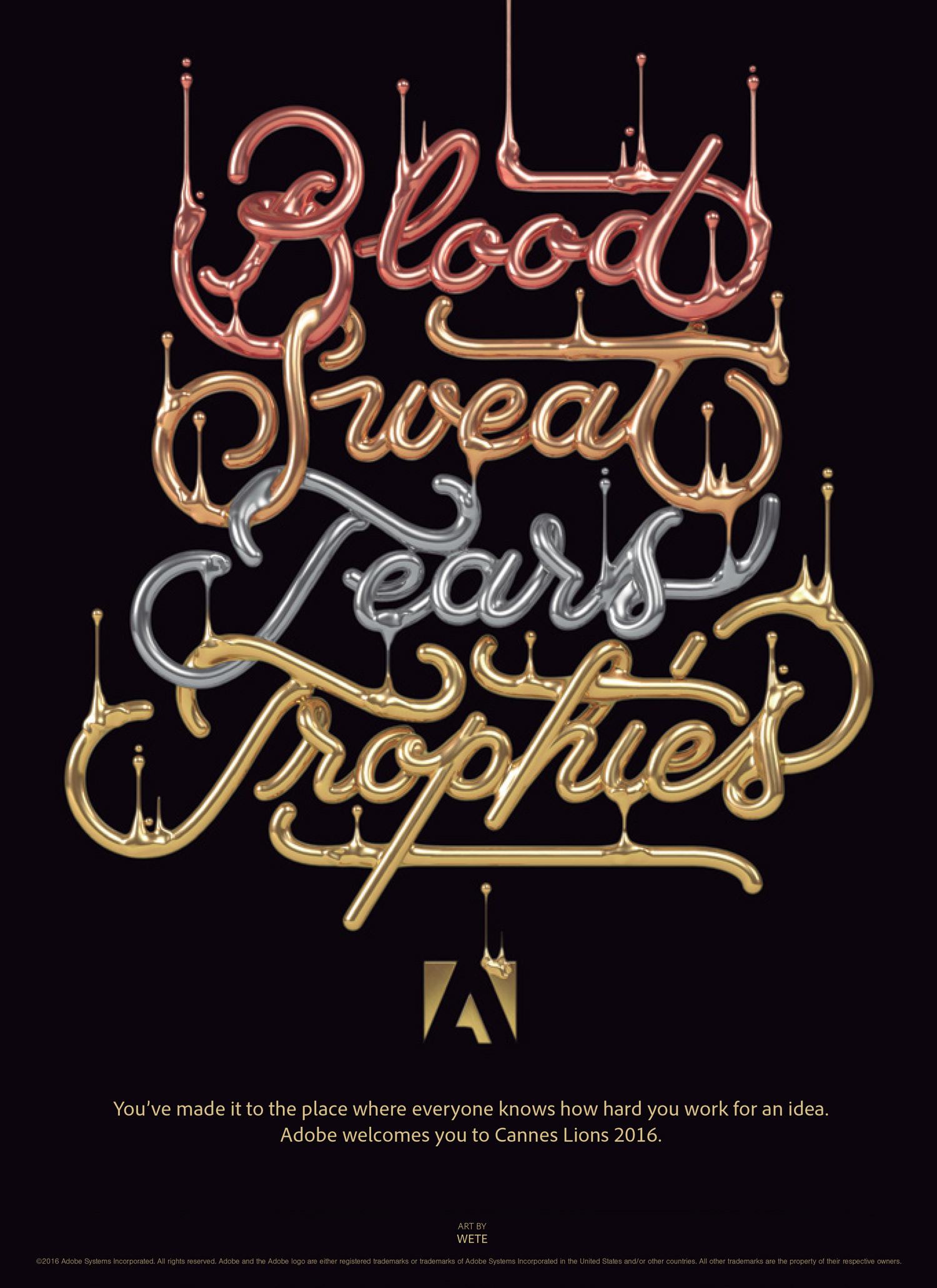 This ad campaign supported Adobe’s presence at the 2016 Cannes Lions International Festival of Creativity. It celebrates festival participants by recognizing how hard they work to get to Cannes – the awards show where they receive the ultimate recognition by their peers. The sentiment “Blood. Sweat. Tears. Trophies.” says Adobe gets it. And the type design celebrates creatives in a very Adobe way: We commissioned various artists to create each of these stunning typographic treatments.