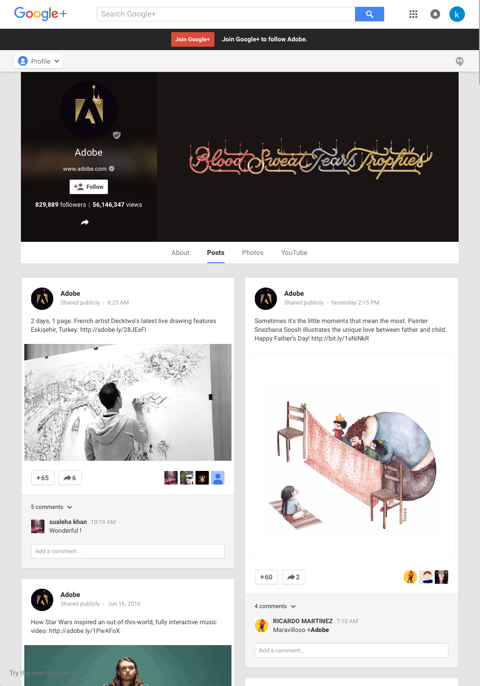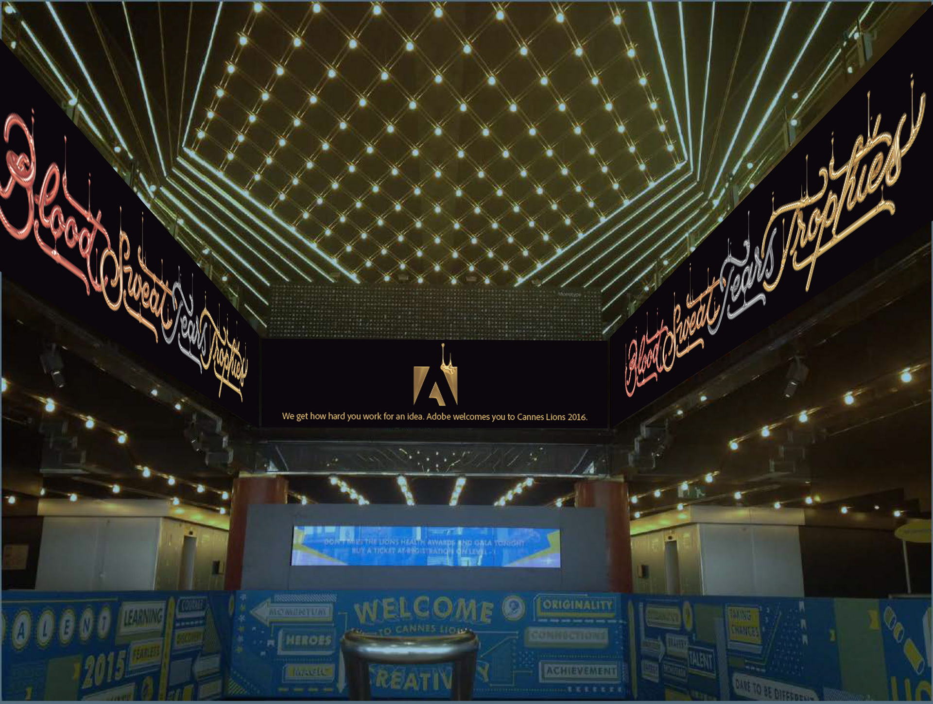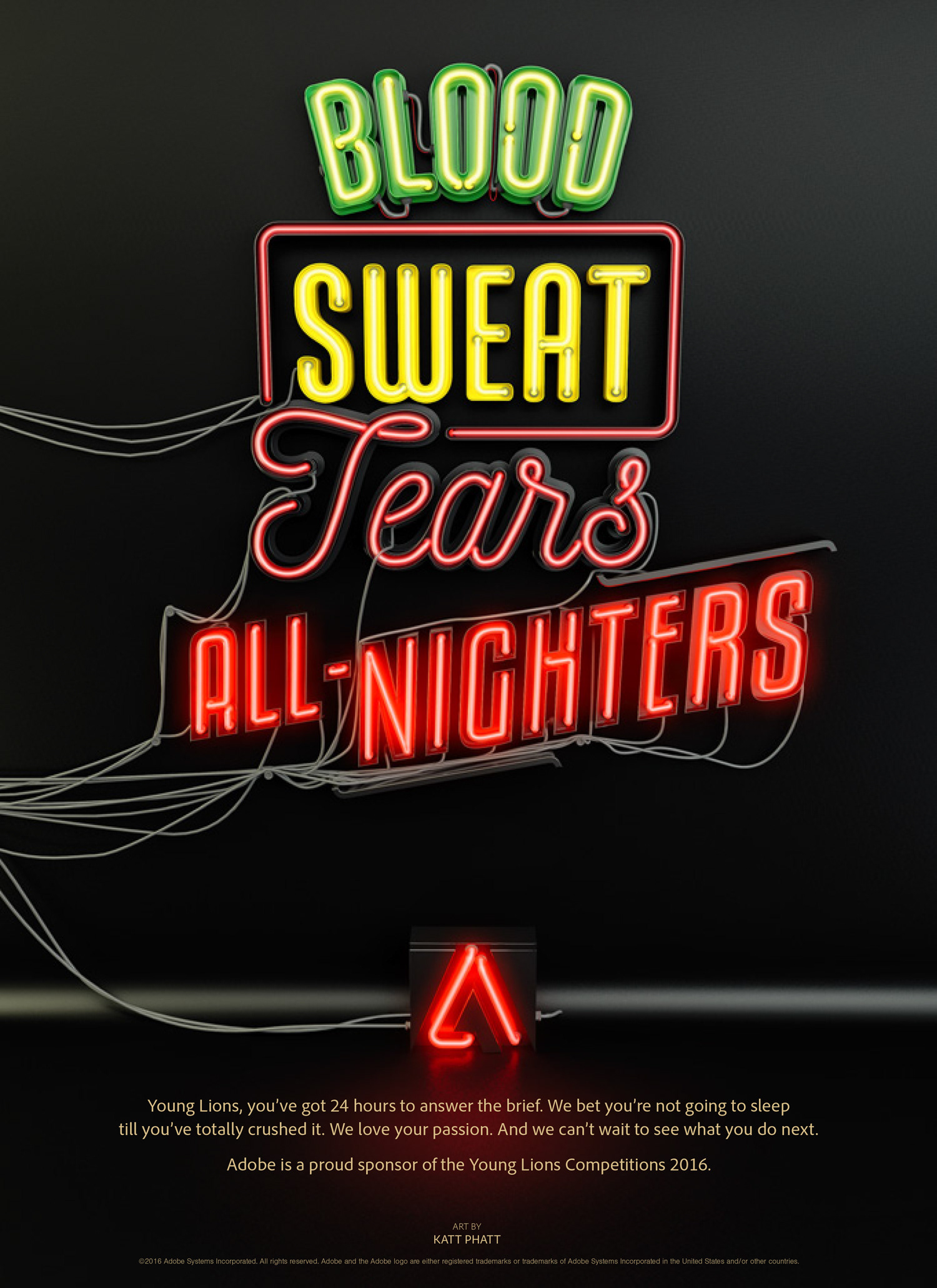 This ad campaign supported Adobe’s presence at the 2016 Cannes Lions International Festival of Creativity. It celebrates festival participants by recognizing how hard they work to get to Cannes – the awards show where they receive the ultimate recognition by their peers. The sentiment “Blood. Sweat. Tears. Trophies.” says Adobe gets it. And the type design celebrates creatives in a very Adobe way: We commissioned various artists to create each of these stunning typographic treatments.